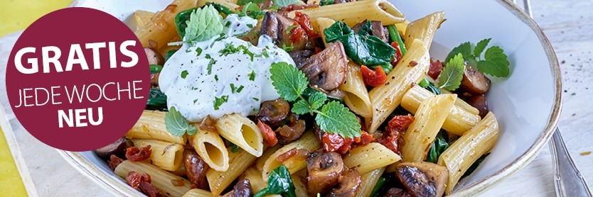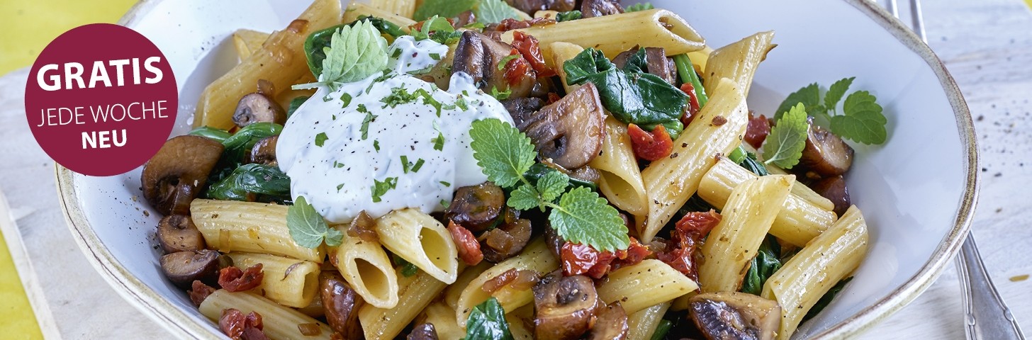 Champignon-Spinat-Nudelpfanne mit Zitronenmelisse-Schmand alle Seiten ansehen