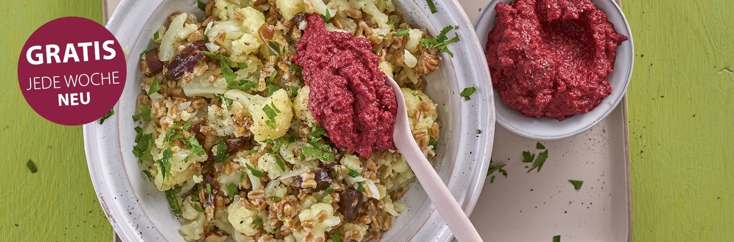 Dinkel-Blumenkohl-Pilaw mit Rote-Bete-Frischkäse-Dip alle Seiten ansehen