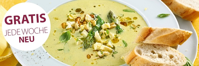Grüne Spargelcremesuppe mit Mozzarella-Basilikum-Pinienkern-Topping alle Seiten ansehen