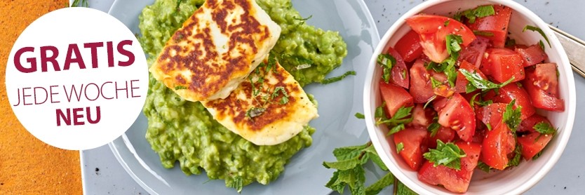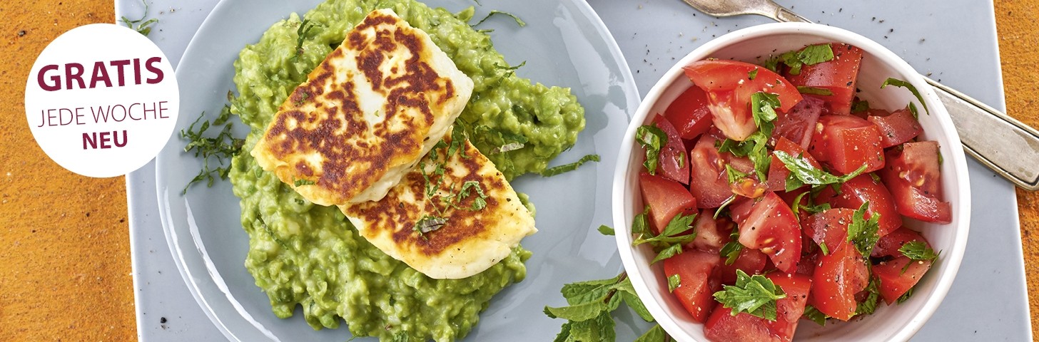 Halloumi auf Erbsen-Minz-Püree mit Tomatensalat alle Seiten ansehen