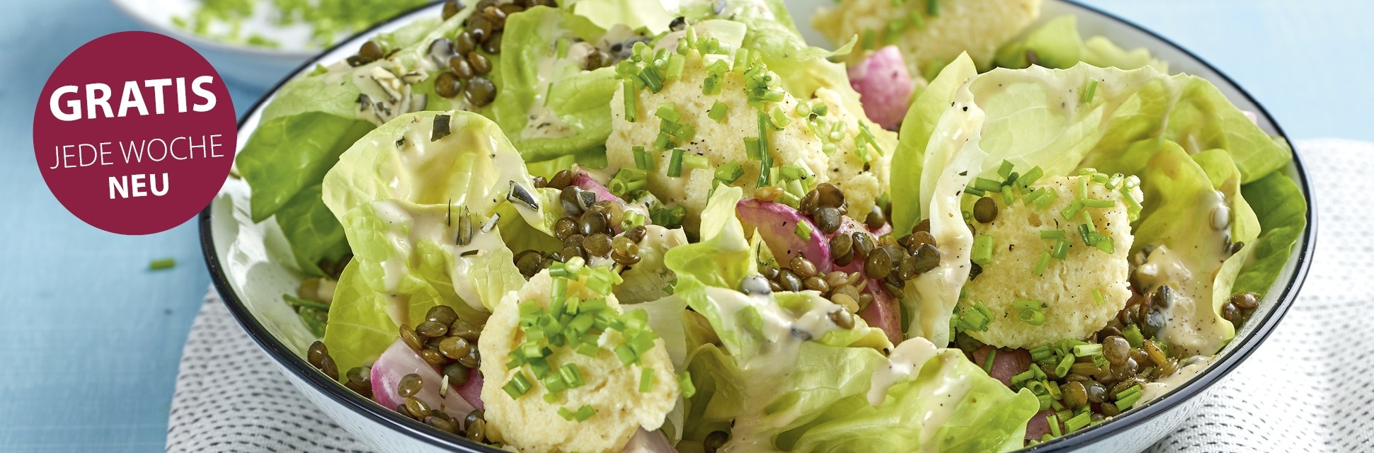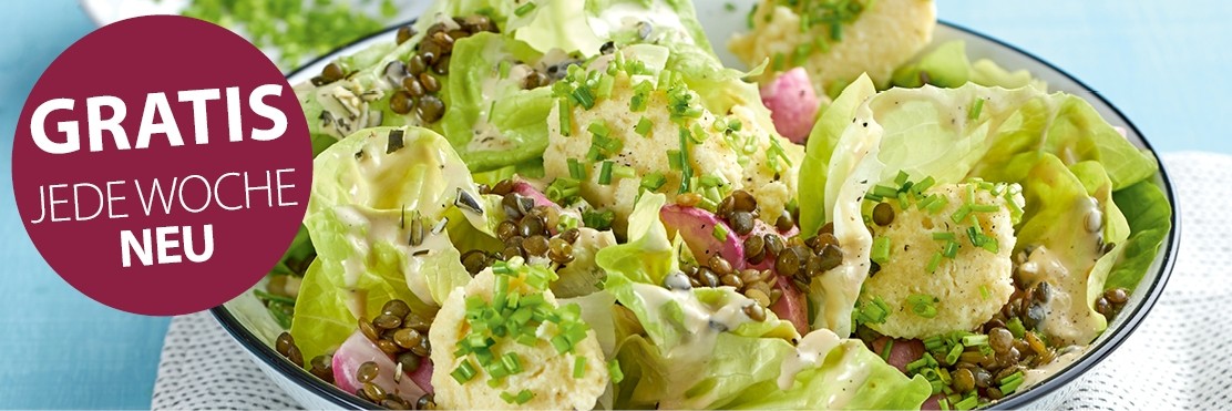 Kopfsalat mit gebackenen Radieschen, Linsen und Ricotta-Schnittlauch-Nocken