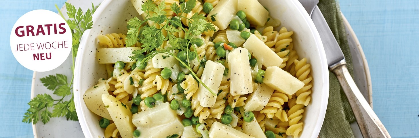 One Pot Pasta mit Kohlrabi, Erbsen, Ziegenkäse und Kerbel alle Seiten ansehen