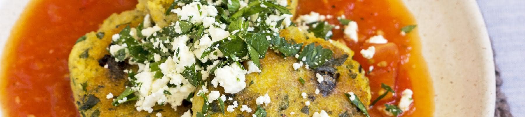 Polenta-Oliven-Taler mit Tomatensoße und Feta