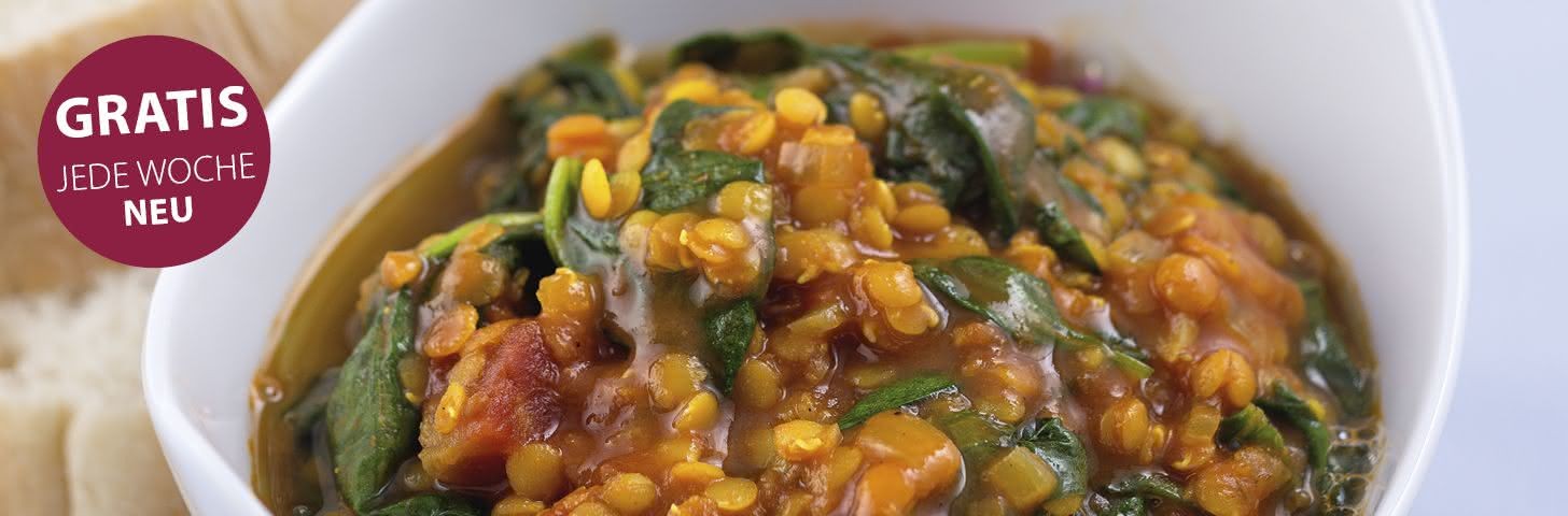 Rote-Linsen-Topf mit Curry-Tomaten-Spinat und Fladenbrot alle Seiten ansehen