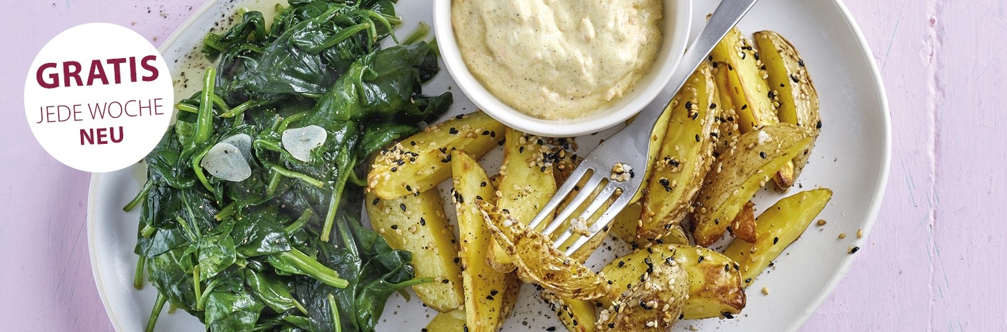 Sesam-Ofenkartoffeln mit Spinat und Möhren-Curry-Quark alle Seiten ansehen