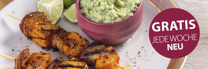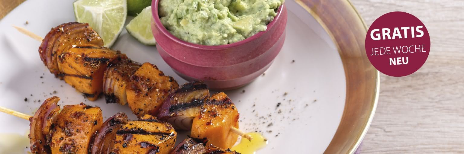 Süßkartoffel-Zwiebel-Kebab mit Avocado-Minz-Remoulade alle Seiten ansehen